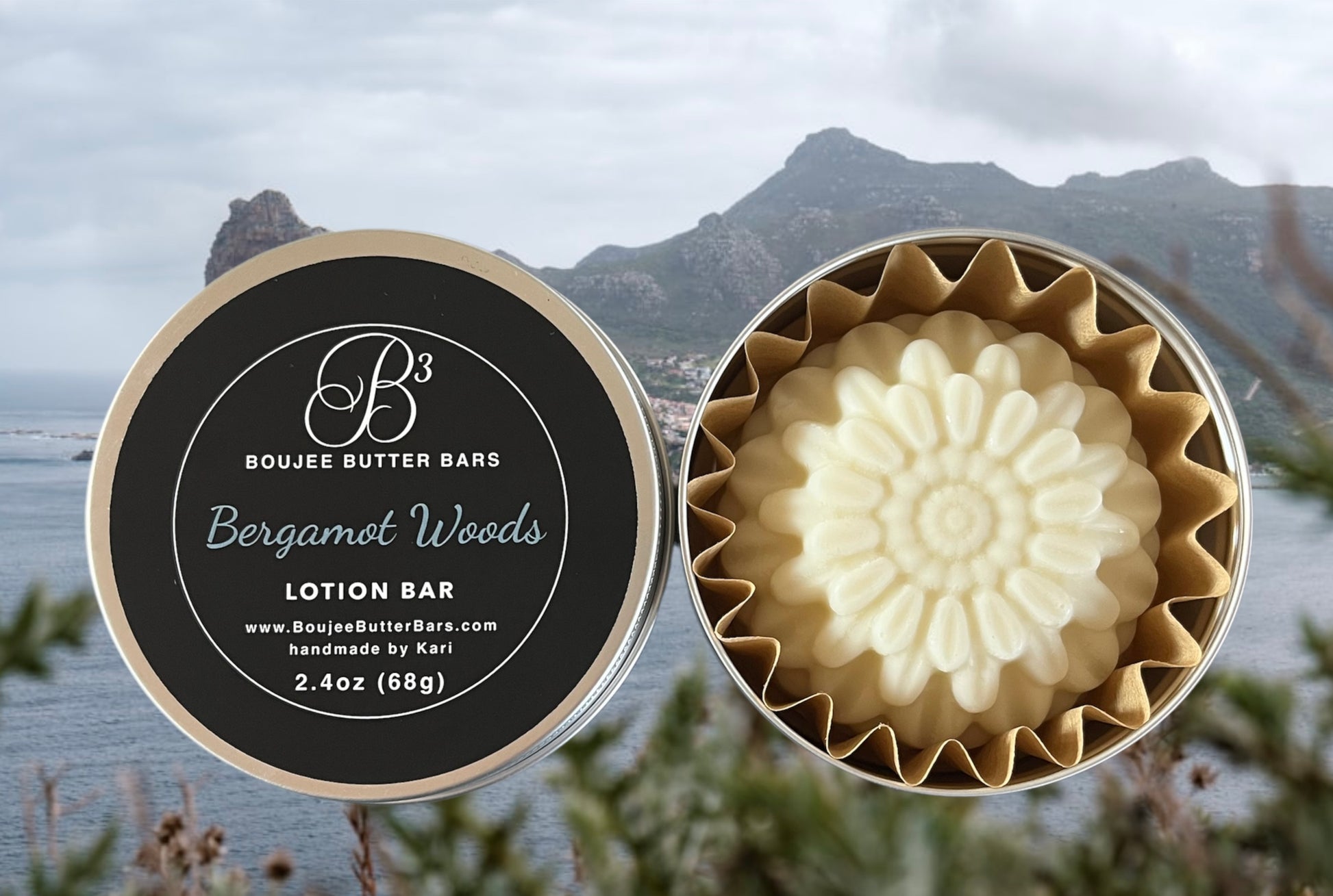 This Lotion Bar has a warm unisex scent. It is scented with Bergamot & Mahogany and smells like a crisp Fall day.